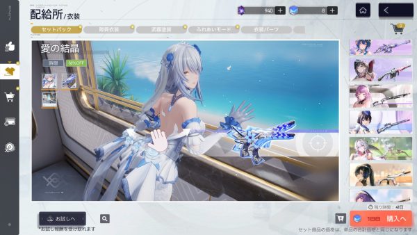 武器の見た目が変えられる武器塗装まで買うといい値段というかかなりの値段だ。でも魅力的な衣装が多かったり花嫁衣装はふれあいモード対象だったりするのでこれは欲しい…!