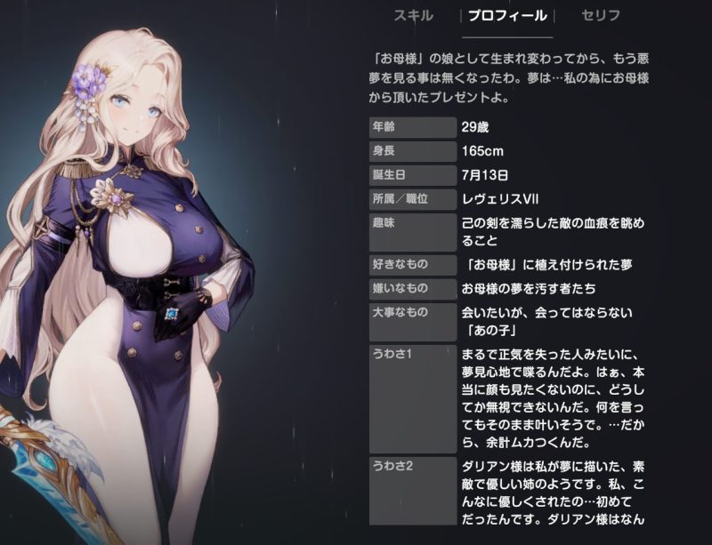 ダリアン初登場からプレイアブルキャラクターになるまでの経緯は、シーズンイベントである「Crimson Destiny VEIL OF TWILIGHT」「INNOCENT FULL MOON」「STIGMA OF DREAMS」で語られているので、読み返してみると面白みがさらに深まると思います。